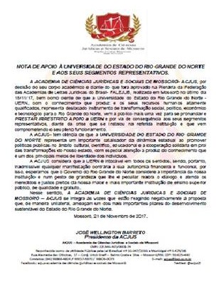 ACADEMIA DE CIÊNCIAS JURÍDICAS E SOCIAIS DE MOSSORÓ – ACJUS, LANÇA NOTA DE APOIO A UERN