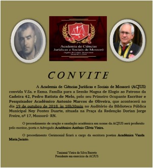 ACJUS: 04 ANOS DIVULGANDO SABERES CULTURAIS.A Academia de Ciências Jurídicas e Sociais de Mossoró (ACJUS) convida V.Sa. e Exma. Família para a Sessão Magna do seu 4º Aniversário de Institucionalização, que acontecerá no dia 05 de novembro de 2018, às 19h00min no Auditório da Biblioteca Pública Municipal Ney Pontes Duarte, situada na Praça da Redenção Dorian Jorge Freire, nº 17, Mossoró- RN.