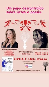 No dia 24 de fevereiro, ocorreu um belo papo sobre artes e poesia com as escritoras Welma e a Mariana Brasil. A última estava na Itália e o papo foi virtual. Parabéns.
