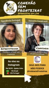 A live entre a entrevistadora e presidente da rede sem fronteira, Dyandreia com a escritora e imortal Socorro Cavalcanti foi muita concorrida. Ocorreu no 18 deste mês as 19h no Brasil e 22h em Portugal. Parabéns a nossa amiga e confreira Socorro.