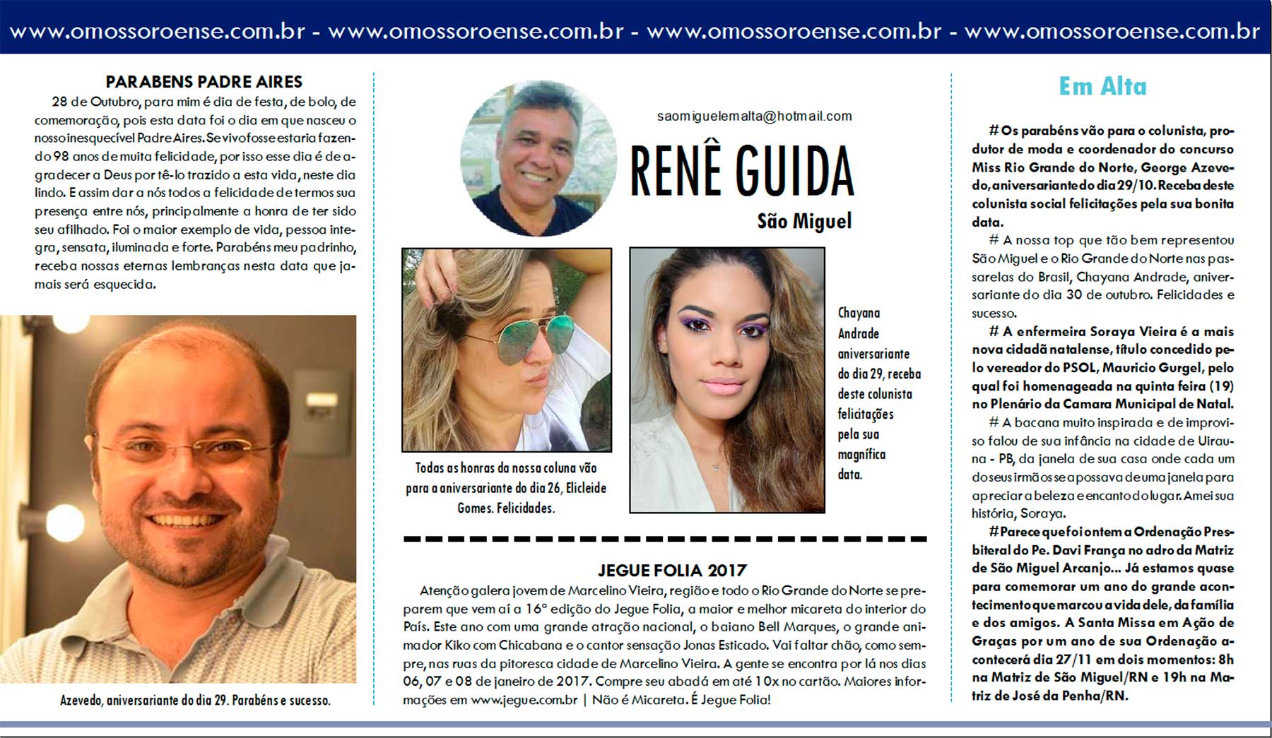 # Os parabéns vão para o colunista, produtor de moda e coordenador do concurso Miss Rio Grande do Norte, George Azevedo, aniversariante do dia 29/10. Receba deste colunista social felicitações pela sua bonita data.