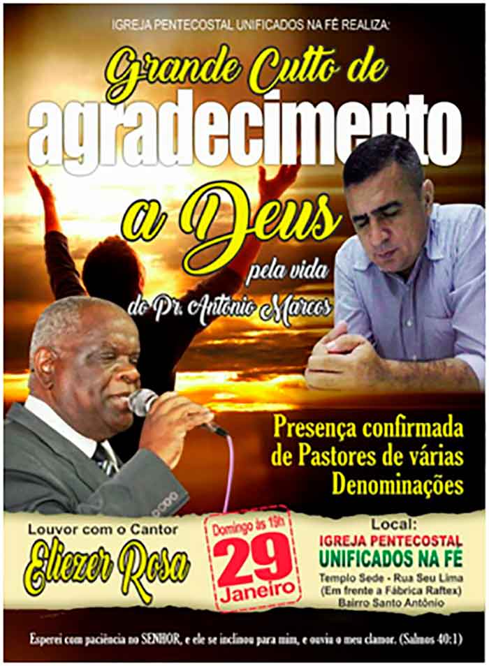 O pastor Antônio Marcos, presidente da igreja unificados na fé, fará grande festa cristã no dia 29 de janeiro, com a presença do cantor Eliezer Rosa.