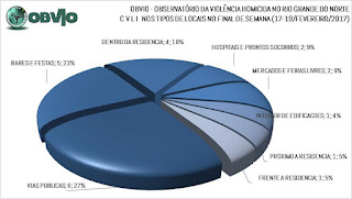 Natal e municípios da Região Metropolitana capitanearam quase que absolutamente a violência homicida nesse final de semana. Natal lidera com 5 CVLIs, seguido de Mossoró e Parnamirim com 3 ocorrências cada. Municípios que registraram 2 CVLIS cada foram: Ceará-Mirim, Currais Novos e Nísia Floresta. Os demais municípios registraram que 1 CVLI em cada: Apodi, Caicó, Macaíba, Pedra Grande e Umarizal.