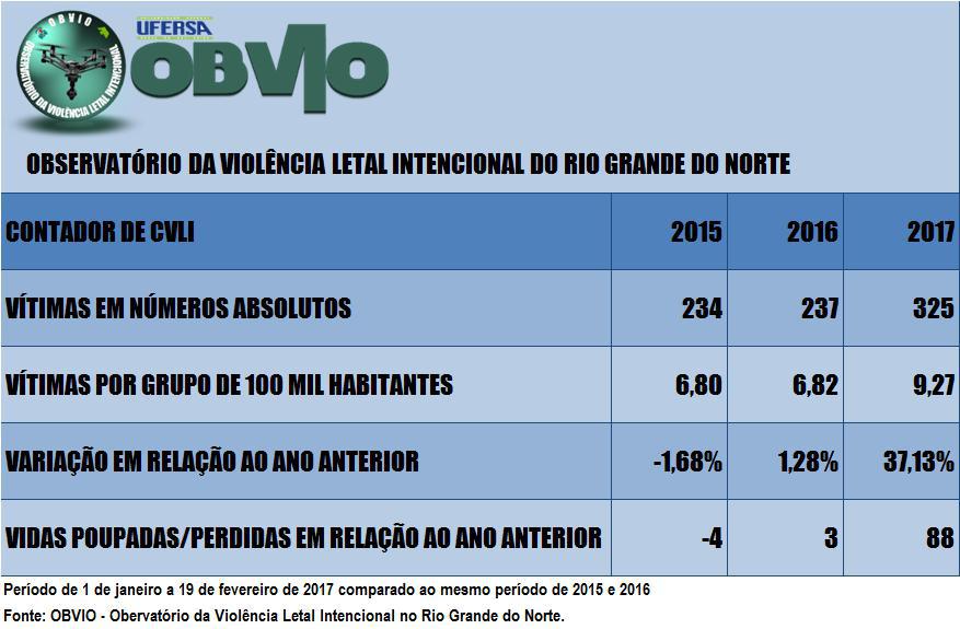 O OBVIO – Observatório da Violência Letal Intencional do RN, apresenta uma nova atualização de CVLIs, no período compreendido entre 1 de janeiro a 19 de fevereiro de 2017 comparado ao mesmo período dos anos de 2015 e 2016.