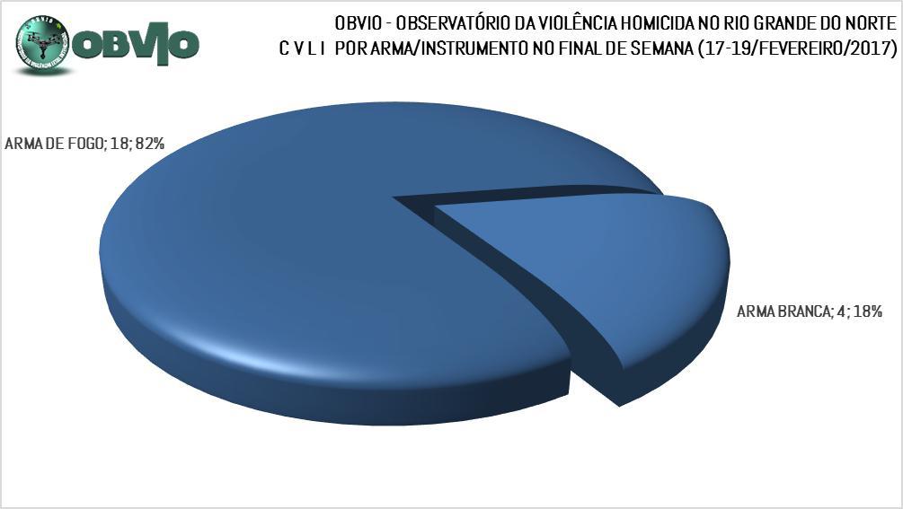 Quanto aos instrumentos letais utilizados para a execução dos CVLIs, o uso de arma de fogo mantêm a predominância, assim como a forma de morte pela execução: 82% das ocorrências (18 do total) foram por esse instrumento. O outro tipo foi a arma branca com 4 ocorrências (18%).