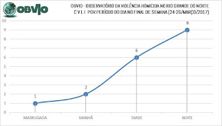 Os dias mais violentos foram, respectivamente, Sábado, com 7 ocorrências (39% do total), seguidos pela Sexta-Feira com 6 CVLIs (33% do total) e pelo Domingo com 5 CVLIs (28% do total). O descontrole dos CVLIS continua, apontando que não há ainda uma perspectiva de abrandamento dos mesmos no RN.