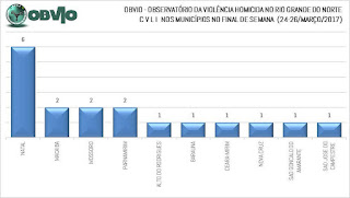 Natal e municípios da Região Metropolitana capitanearam quase que absolutamente a violência homicida nesse final de semana. Natal lidera com 6 CVLIs, seguido de Macaíba, Mossoró e Parnamirim com 2 ocorrências cada.  Municípios que registraram 1 CVLI cada foram: Baraúna,  Alto do Rodrigues, Ceará-Mirim, Nova Cruz, São Gonçalo do Amarante e São José do Campestre.