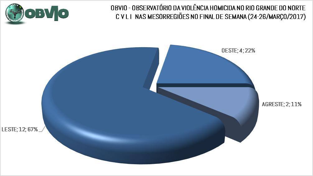 A dinâmica da violência elenca fatores que têm levado a concentração de CVLI no Leste Potiguar já foram amplamente divulgados por este Observatório em diversos relatórios, que desta feita foi responsável por 67% dos homicídios do final de semana (12 do total), seguida pelo Oeste Potiguar com 4 ocorrências (22% do total). A região Agreste Potiguar, teve 2 ocorrências (11%). A região Central não computou nenhum CVLI.
