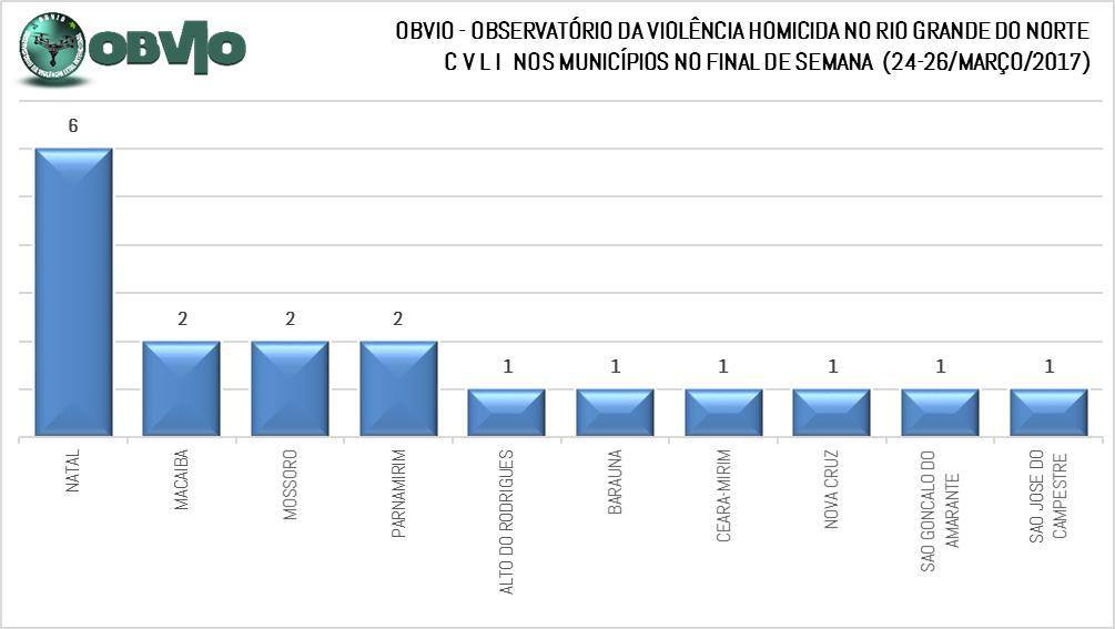 Natal e municípios da Região Metropolitana capitanearam quase que absolutamente a violência homicida nesse final de semana. Natal lidera com 6 CVLIs, seguido de Macaíba, Mossoró e Parnamirim com 2 ocorrências cada.  Municípios que registraram 1 CVLI cada foram: Baraúna,  Alto do Rodrigues, Ceará-Mirim, Nova Cruz, São Gonçalo do Amarante e São José do Campestre.