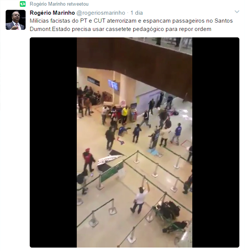 No Tweeter, Rogério Marinho compartilhou o vídeo de uma confusão ocorrida na sexta-feira no Aeroporto Santos Dumont, no Rio de Janeiro. O deputado potiguar afirmou que seria necessário “usar cassetete pedagógico”.