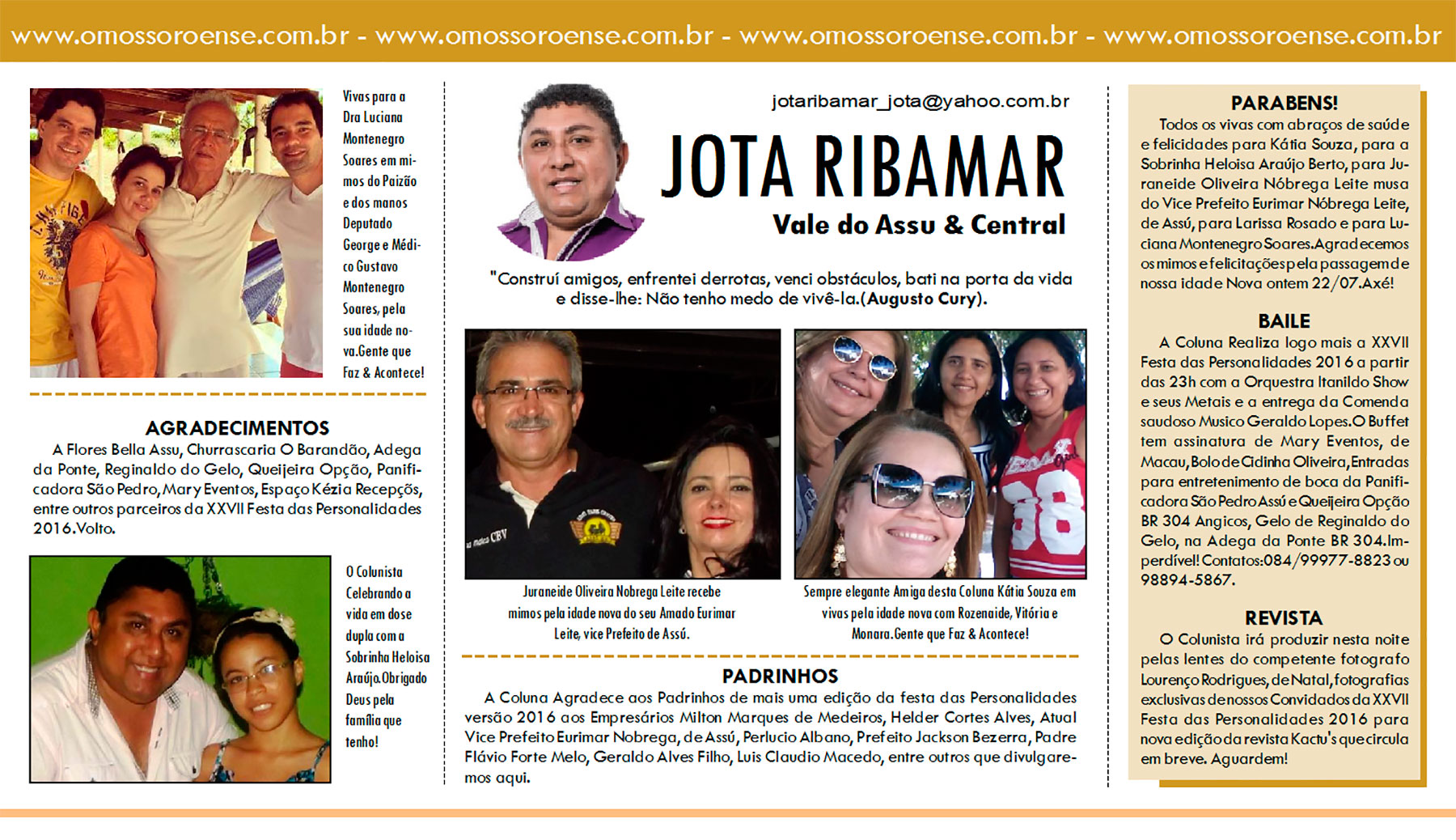 A Coluna Agradece aos Padrinhos de mais uma edição da festa das Personalidades versão 2016 aos Empresários Milton Marques de Medeiros, Helder Cortes Alves, Atual Vice Prefeito Eurimar Nobrega, de Assú, Perlucio Albano, Prefeito Jackson Bezerra, Padre Flávio Forte Melo, Geraldo Alves Filho, Luis Claudio Macedo, entre outros que divulgaremos aqui.