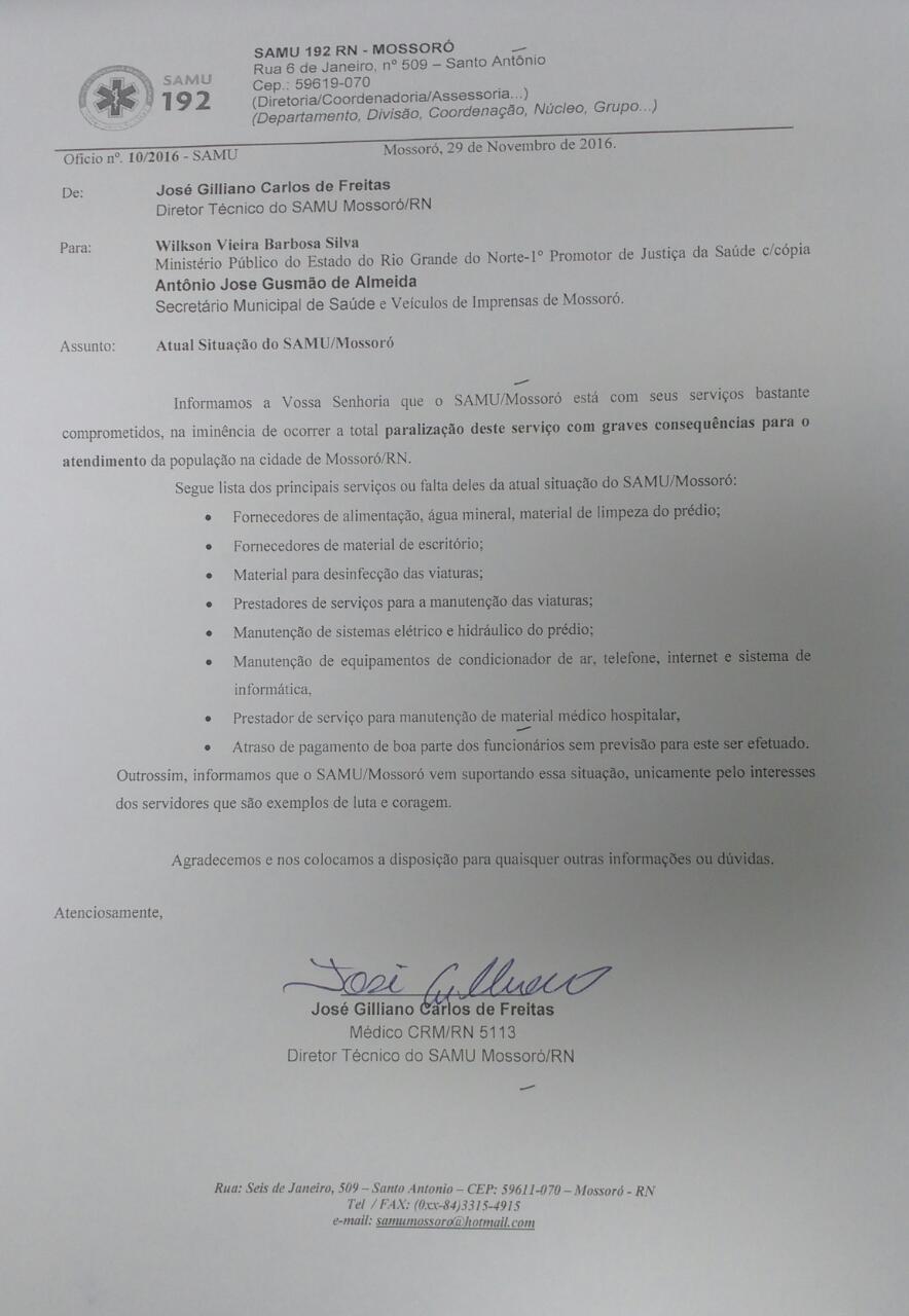 Em documento enviado ao Ministério Público do Rio Grande do Norte (MP/RN), com cópia para o Secretário Municipal de Saúde, Antônio José Gusmão, o diretor do Serviço de Atendimento Móvel de Urgência (SAMU), José Giliano Carlos, afirma que o serviço está bastante comprometido e prestes a sofrer total paralisação na cidade.