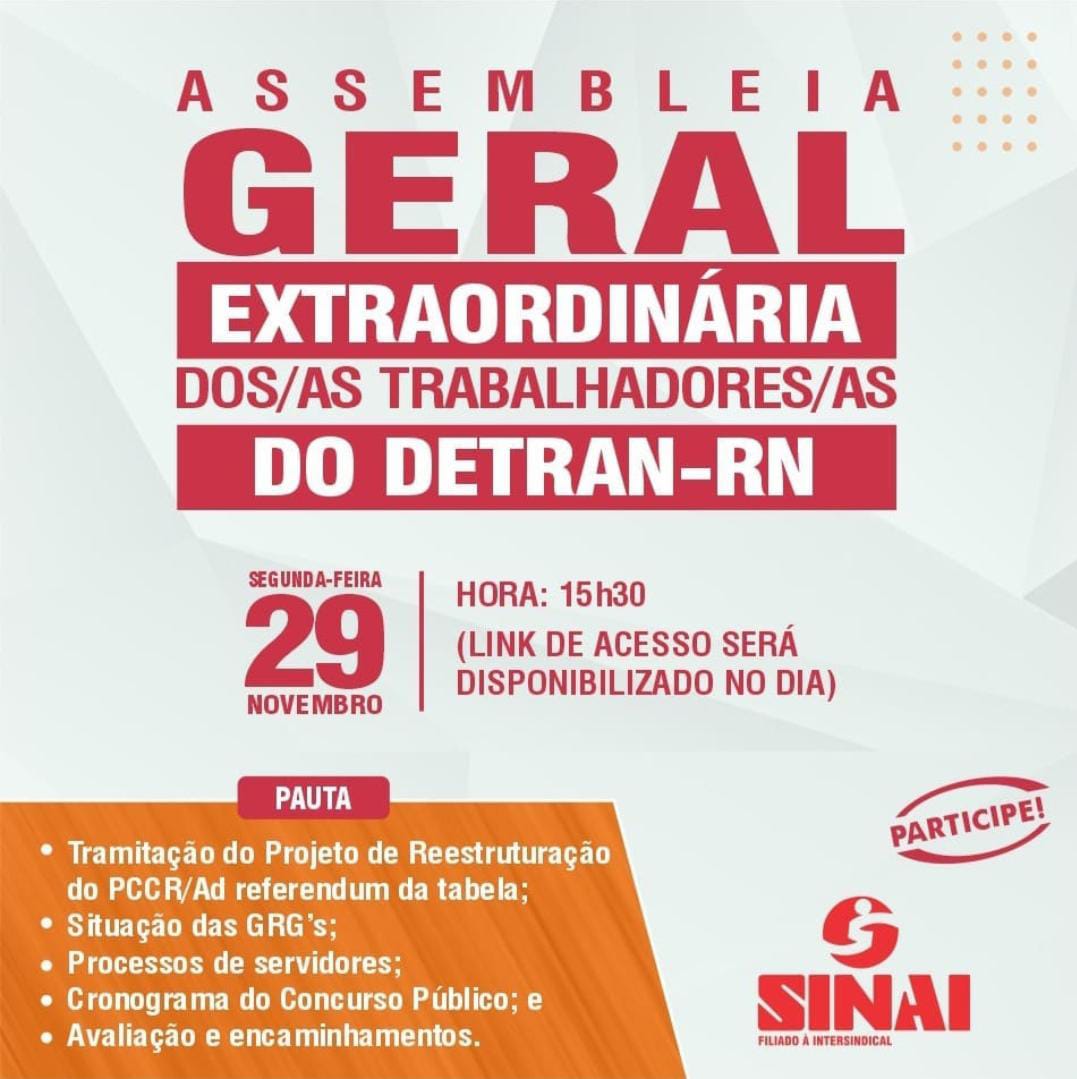 Os servidores do Departamento Estadual de Trânsito do RN (DETRAN/RN) realização, no dia 29 de novembro, uma assembleia extraordinária, para discutir sobre o Plano de Cargos, Carreiras e Remunerações (PCCR), além de outras pautas que nortearam a greve da categoria.