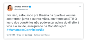 “Pra pessoas com deficiências, doenças graves ou raras, isso tem um impacto brutal. É a mamata dos planos de saúde sendo institucionalizada! (…) Estou indo pra Brasília na quarta e vou me acorrentar, junto a outras mães, em frente ao STJ! O lucro dos convênios não pode estar acima do direito à vida e à saúde, assegurado na Constituição!”