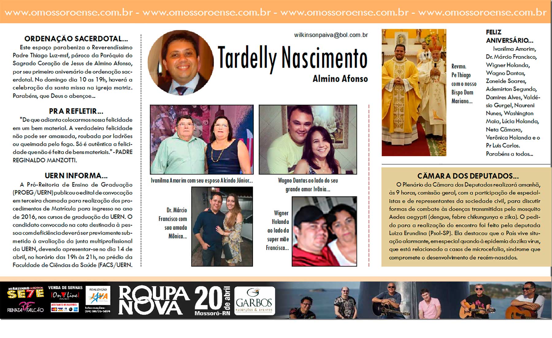 Este espaço parabeniza o Reverendíssimo Padre Thiago Luz-msf, pároco da Paróquia do Sagrado Coração de Jesus de Almino Afonso, por seu primeiro aniversário de ordenação sacerdotal. No domingo dia 10 as 19h, haverá a celebração da santa missa na igreja matriz. Parabéns, que Deus o abençoe…