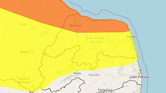 O outro nível em questão no grau de severidade do Inmet é o alerta vermelho, que representa grande perigo e prevê chuvas acima de 100 mm por dia. Não há alerta deste tipo emitido para o RN.