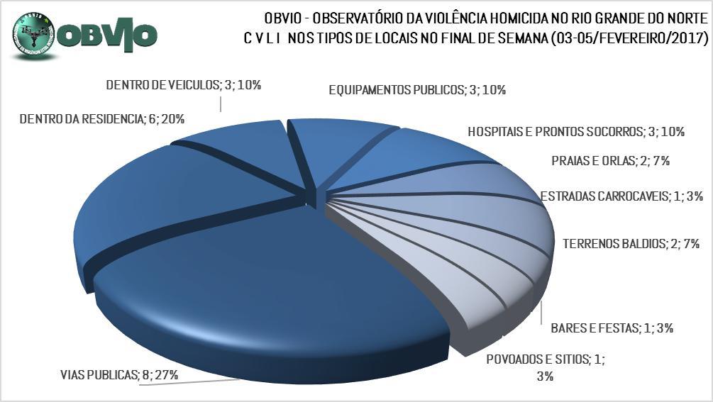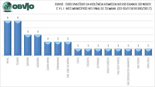 Natal e municípios da Região Metropolitana capitanearam quase que absolutamente a violência homicida nesse final de semana. Natal lidera com 5 CVLIs, seguido de Touros (fugindo do padrão), com também 5 ocorrências. Macaíba e Mossoró tiveram 3 CVLIS cada. Parnamirim, Ceará-Mirim e São José de Mipibu contaram com 2 CVLIs cada. Os demais municípios registraram 1 CVLI em cada: Caicó, Encanto, Extremoz, Nísia Floresta, Pau dos Ferros, São Gonçalo do Amarante, São Pedro e Vera Cruz.